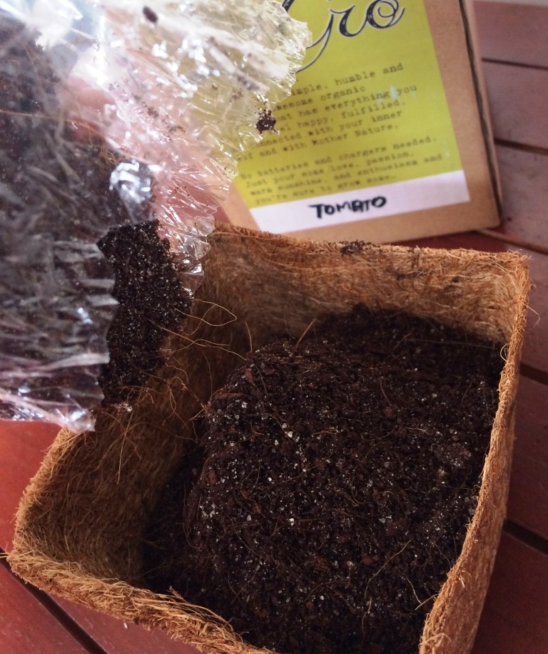 After transferring the soil to the environmentally friendly coconut pot, one needs to slightly press the mixture to eliminate stubborn air pockets then dampen it with water to provide the right environment for seeds to germinate. ย For my tomato plant, I drop a minimum of five seeds into the pot and cover it with soil, the thickness not exceeding its diameter. I water the pot very lightly then seal it with plastic. I also spray water on the plastic (moist side inside) and seal it with a rubber band. It is explained that this will help retain the moisture that the seeds need to germinate properly. Regularly, I remove the wrap to moist the plastic then seal the pot again. By the way, aside from the tomato seeds, I also requested for sunflower.
